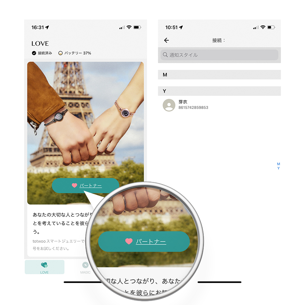 回答:世界中に使えます!、二人がどれだけ離れていても、Totwoo スマート ジュエリーがアプリで Wifi またはモバイル接続に適切に設定されていれば、お互いににつながることができます。