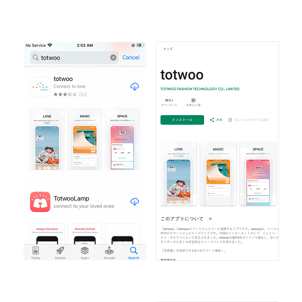 お使いのデバイスに応じて、App Store または Google Play ストアから「totwoo」アプリを検索してダウンロードします。