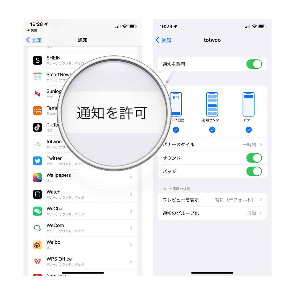 設定ー通知-通知を許可する